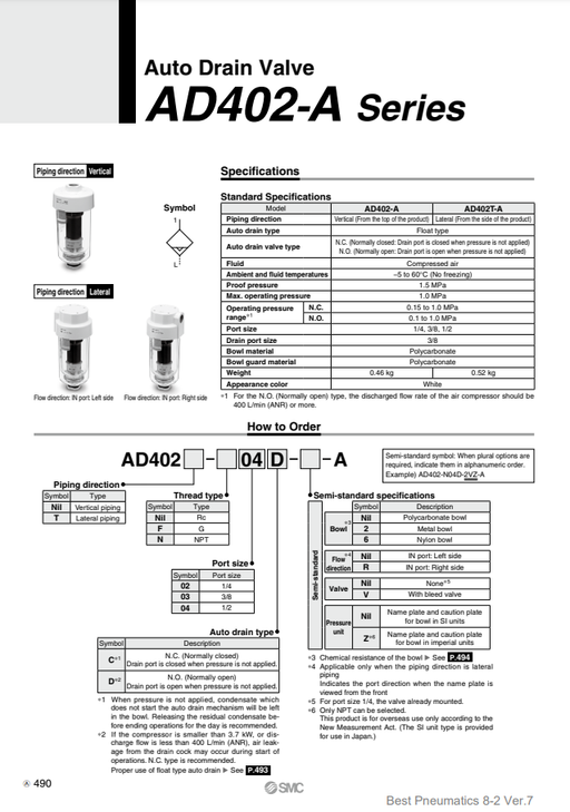 [SMC Pneumatics]Auto Drain Valve AD402-02D-A