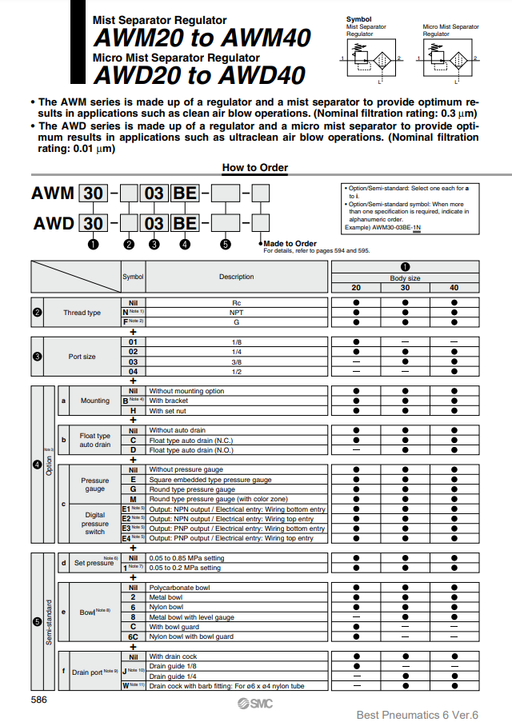 [SMC Pneumatics]Mist Separator Regulator AWM40-04BE